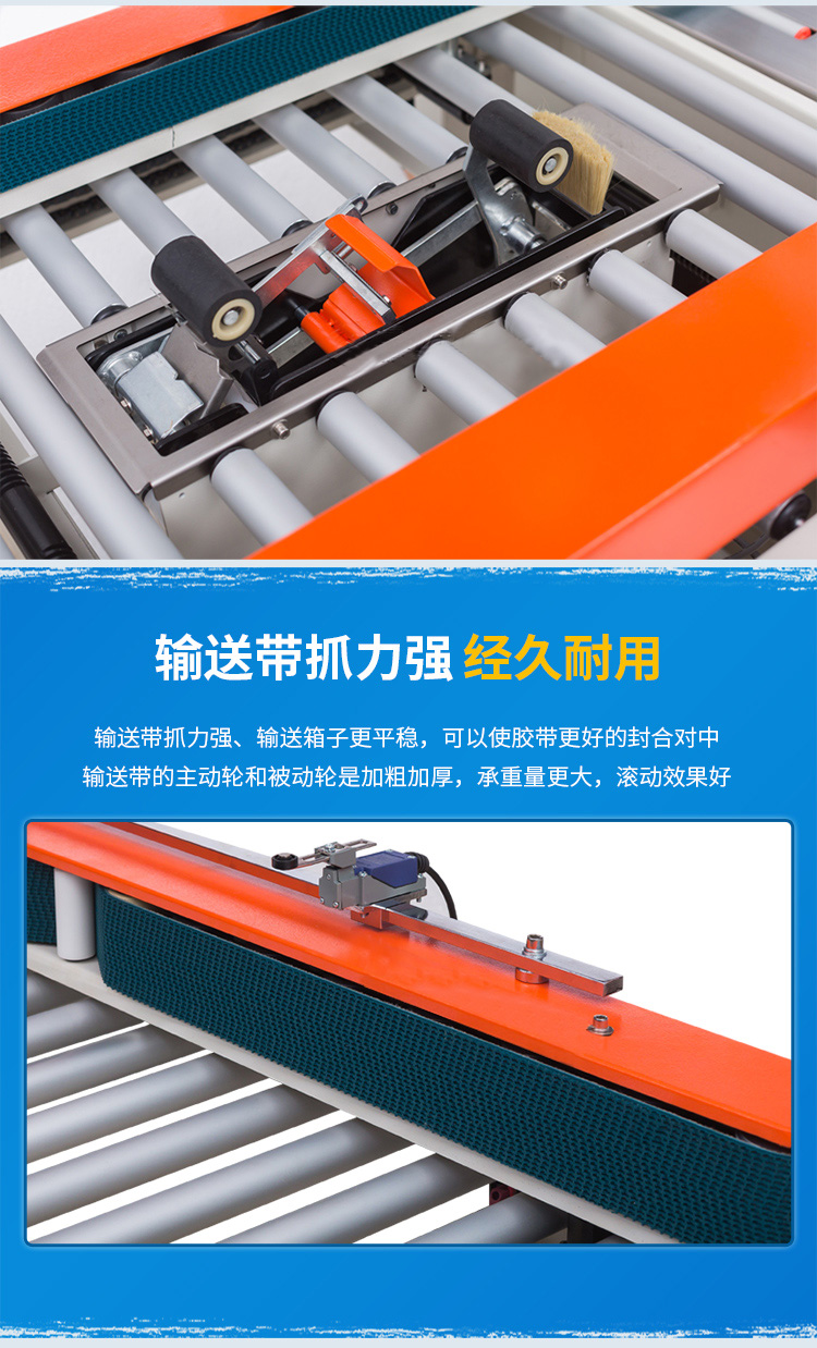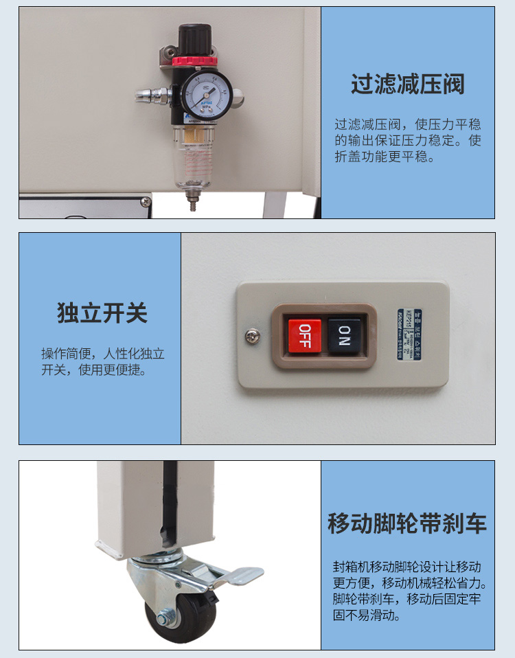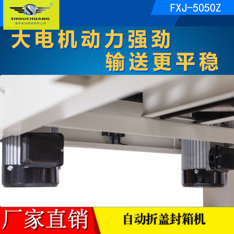自动折盖封箱机主要适用于纸箱的折盖和封箱包装,适合单独操作或连接到自动流水线,广泛应用在家用电器,纺织,食品,百货,医药,化工等行业。纸箱上前盖,侧盖及后盖自动折入,快速,平顺。