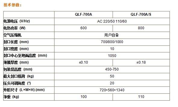 QLF-700A气动塑料薄膜大袋封口机可以手动或通过脚踏开关操作。热封较厚的包装袋,可以采用双加热的机型QLF-700A/S。