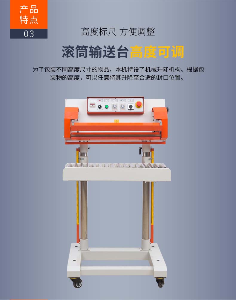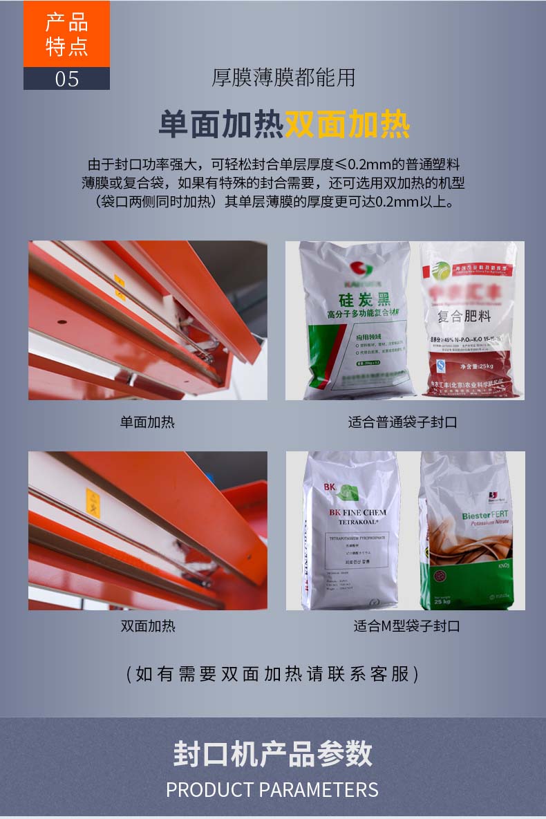 本气动塑料薄膜大袋封口机在化工、粮食、食品、饲料等行业得到广泛应用。适用于封口长度小于700mm、重量小于50kg的塑料袋或复合袋的间歇包装封口。特殊订货可将封口长度增大至800mm、1000mm,也可以与其连接的输送台和生产流水线配套。