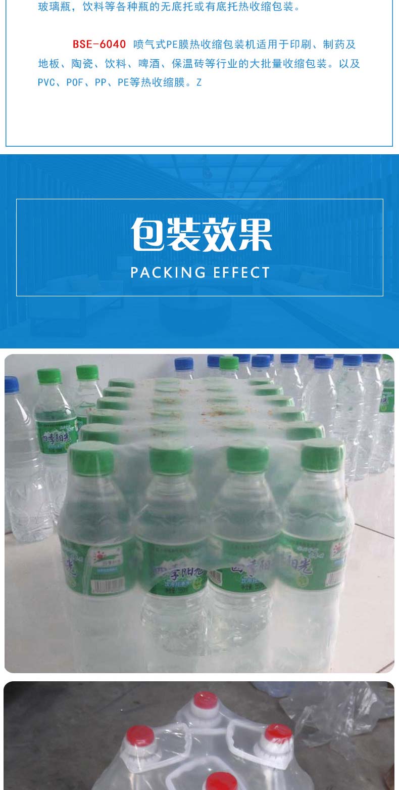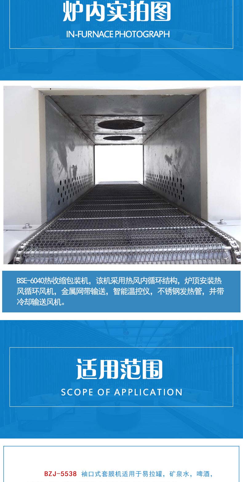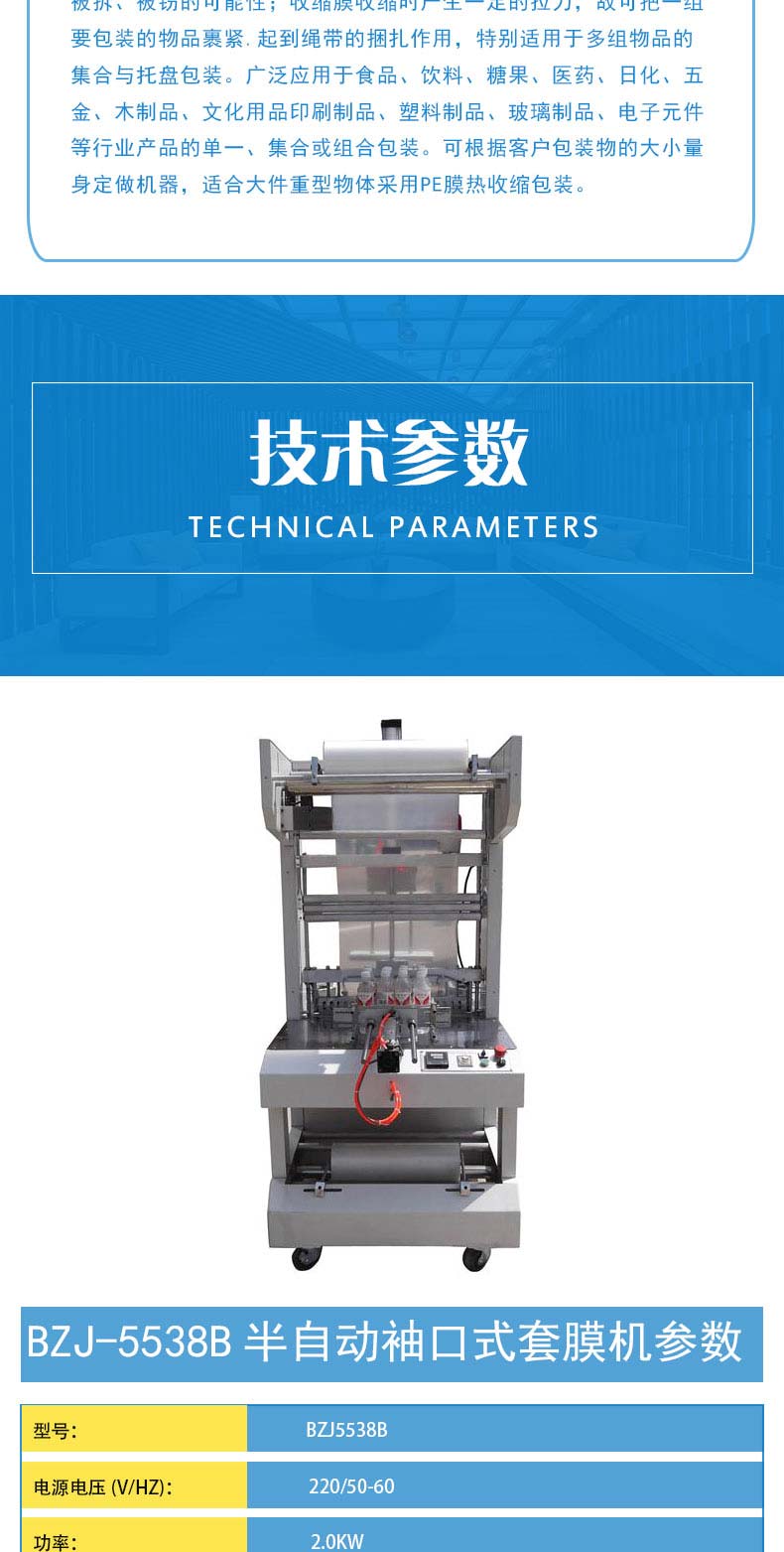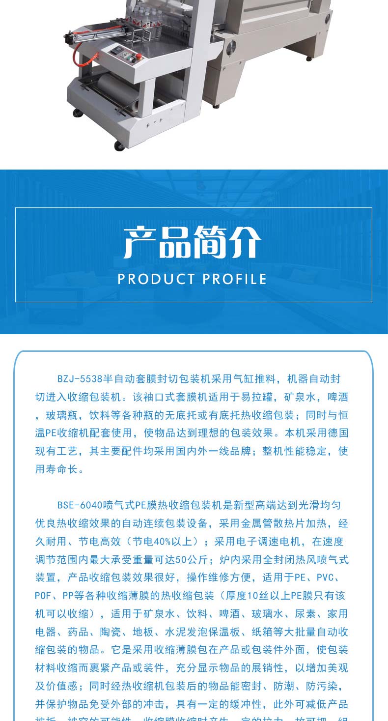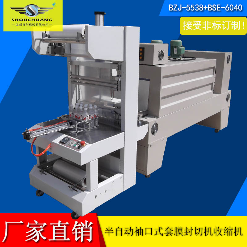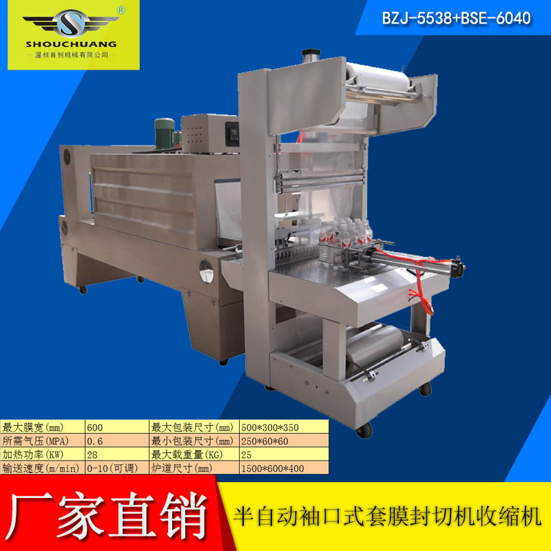 BZJ-5538半自动套膜封切包装机采用气缸推料,机器自动封切进入收缩包装机。该袖口式套膜机适用于易拉罐,矿泉水,啤酒,玻璃瓶,饮料等各种瓶的无底托或有底托热收缩包装;同时与恒温PE收缩机配套使用,使物品达到理想的包装效果。本机整机性能稳定,使用寿命长。