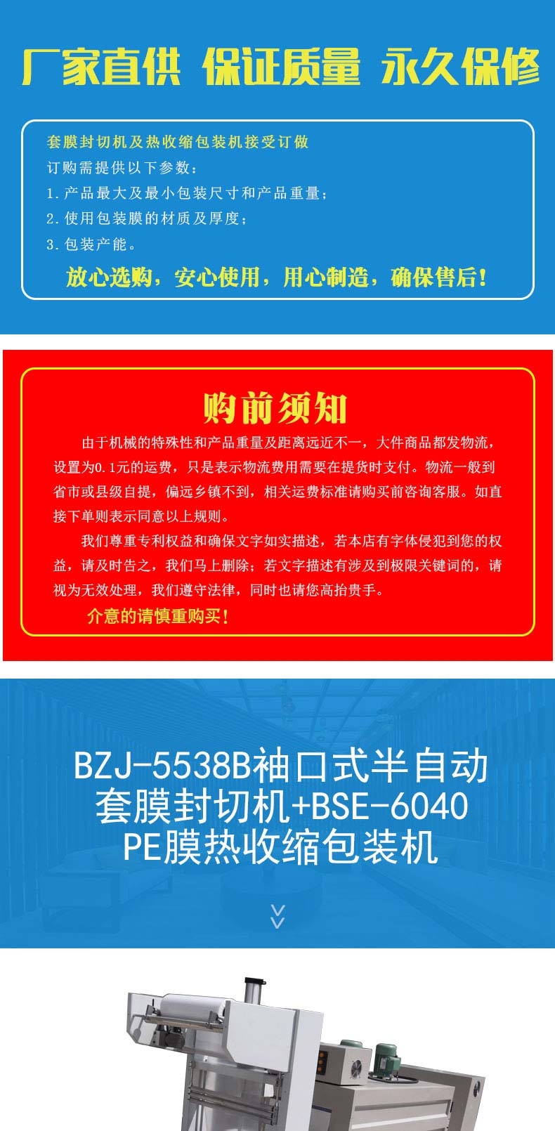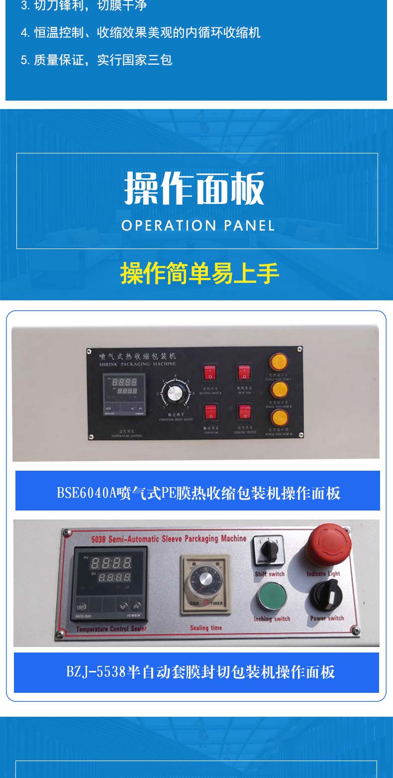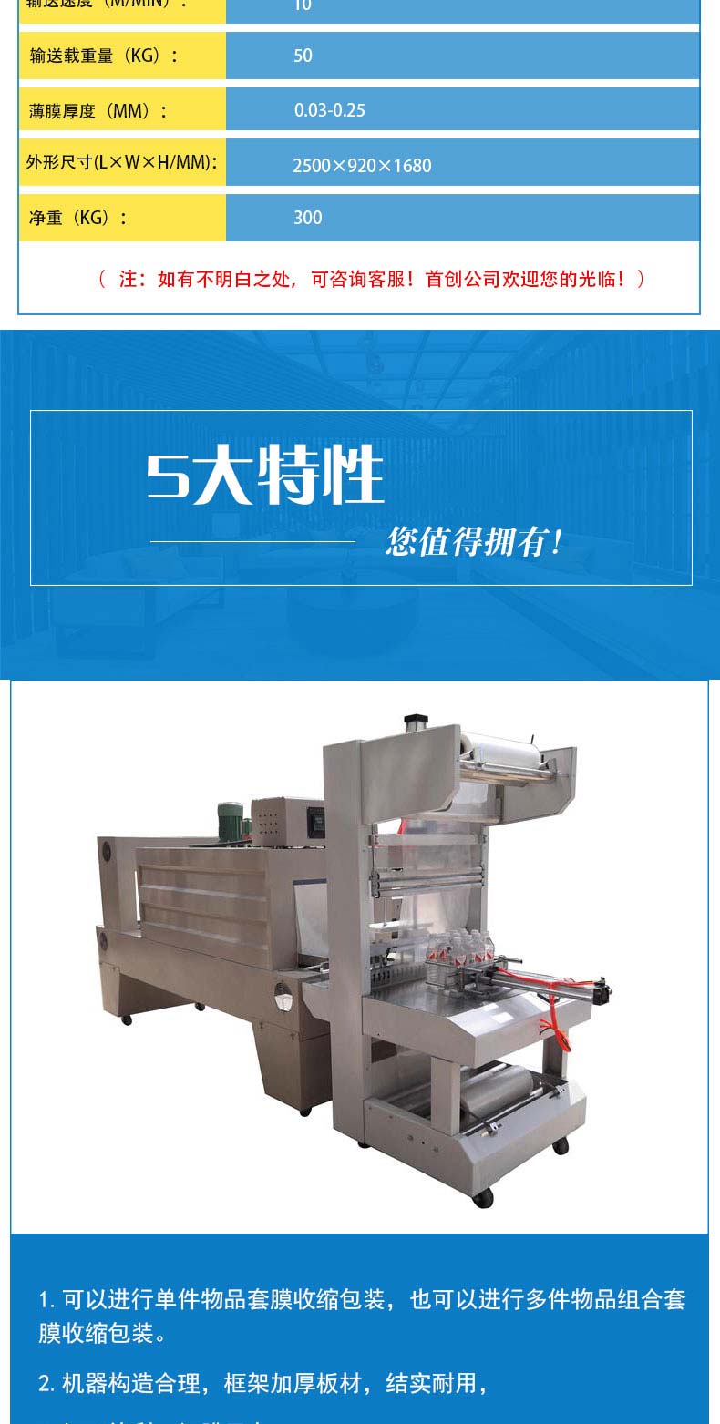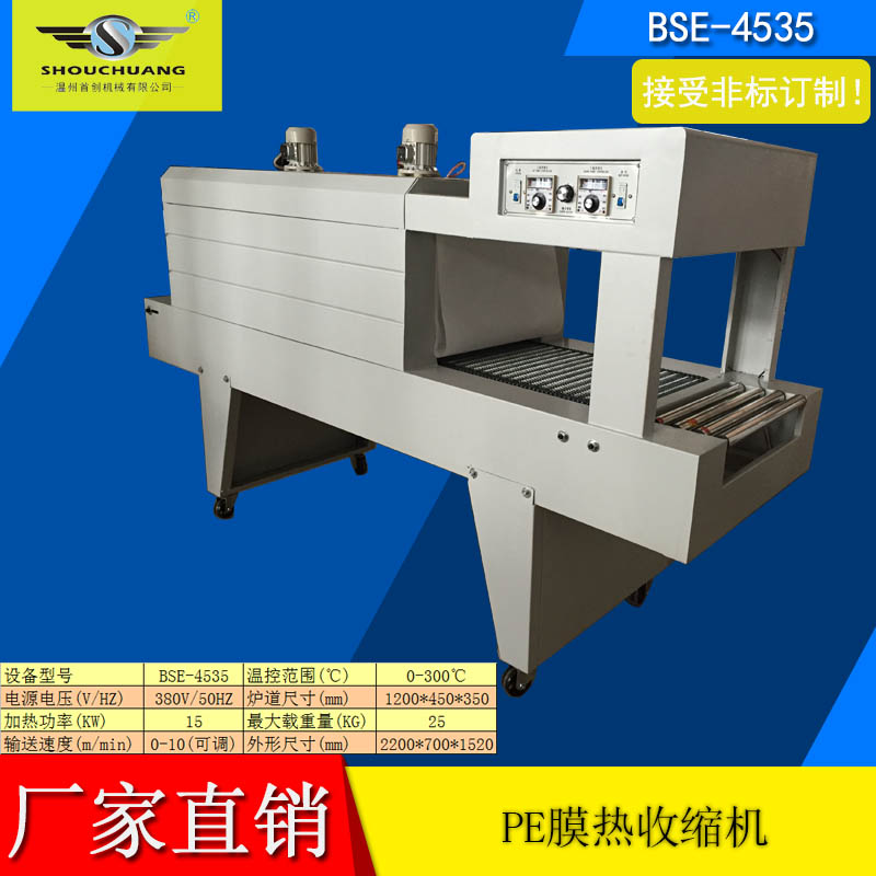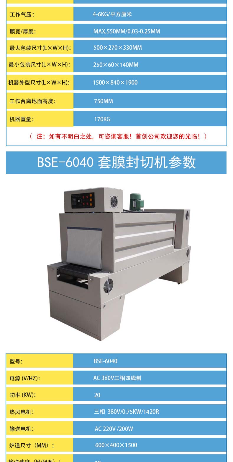 BZJ-5538半自动套膜封切包装机采用气缸推料,机器自动封切进入收缩包装机。该袖口式套膜机适用于易拉罐,矿泉水,啤酒,玻璃瓶,饮料等各种瓶的无底托或有底托热收缩包装;同时与恒温PE收缩机配套使用,使物品达到理想的包装效果。本机整机性能稳定,使用寿命长。