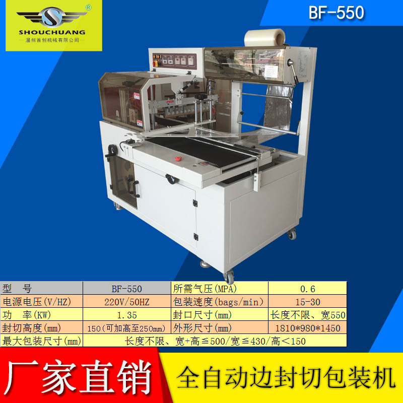 BF-450A系列边封型全自动封切机适用于软件、食品、化妆品、印刷、制药及地板、陶瓷、饮料、五金等行业的大批量收缩包装。适用于POF膜包装.