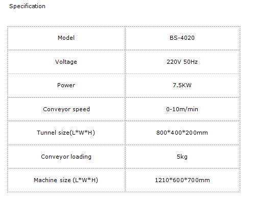 BS-4020 thermal shrink packaging machine is suitable for shrink films such as POV, PVC, PP, POF, etc. There are shrinking tubes on the top, bottom and sides of the shrinking room. The temperature of the shrink room and the speed of the conveyer are adjustable. And the size of the machine can be customized.