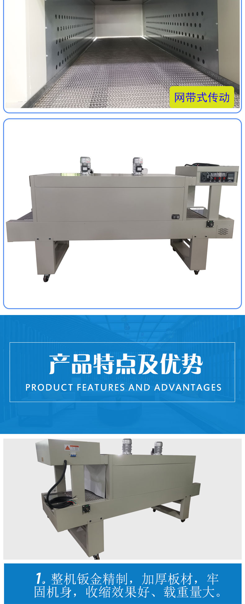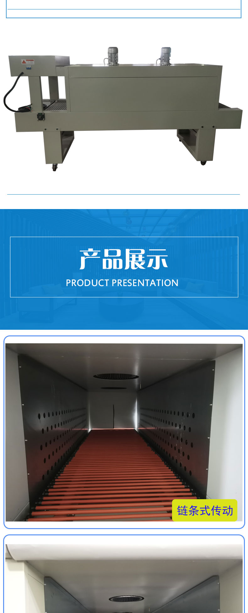 1. Adopt two high power blowing motors to ensure enough circulating air and uniform temperature inside the tunnel.