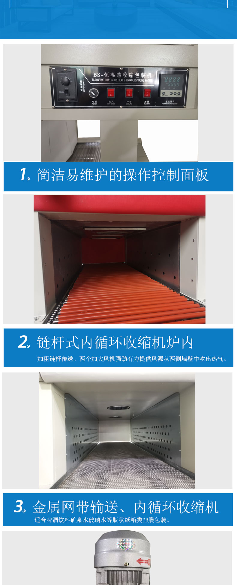 BS-60 series shrink tunnel is used to shrink pack goods, such as cans, glass bottles, beer, mineral water etc, in wood, rolled steel, ceramics, household appliances, computers industries and more.
