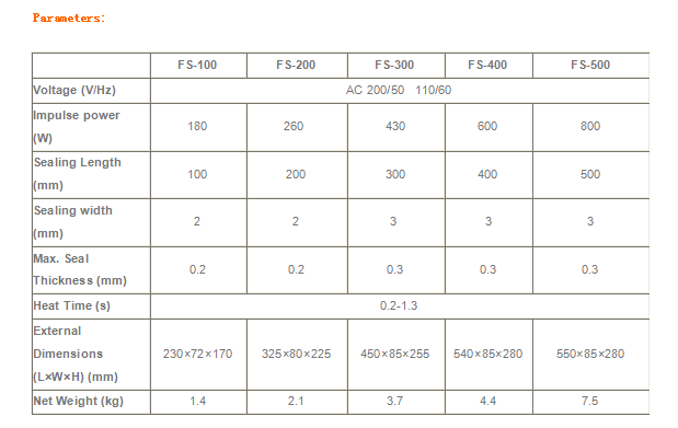FS series hand impulse sealers are widely applied to seal all kinds of plastics films, compound films and aluminum-plastic film. FS series can be divided into several models. Among them model with letter "ABS" hand impulse sealer is made from engineering plastic. The sealer with letter "B" in model name can print label while sealing.