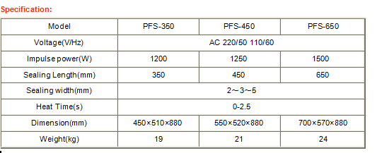 PFS Series pedal Impluse sealer is suitable for sealing all kinds of polyethylene and polyproplylene film recombined materials and aluminum-plastic film as well. They can be widely used for batch manufacturing of foods, medicine, hardware, they are used to seal equipment in super market, family and factory.