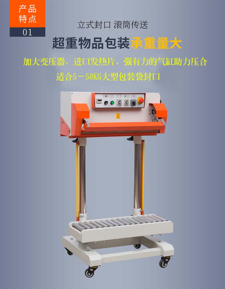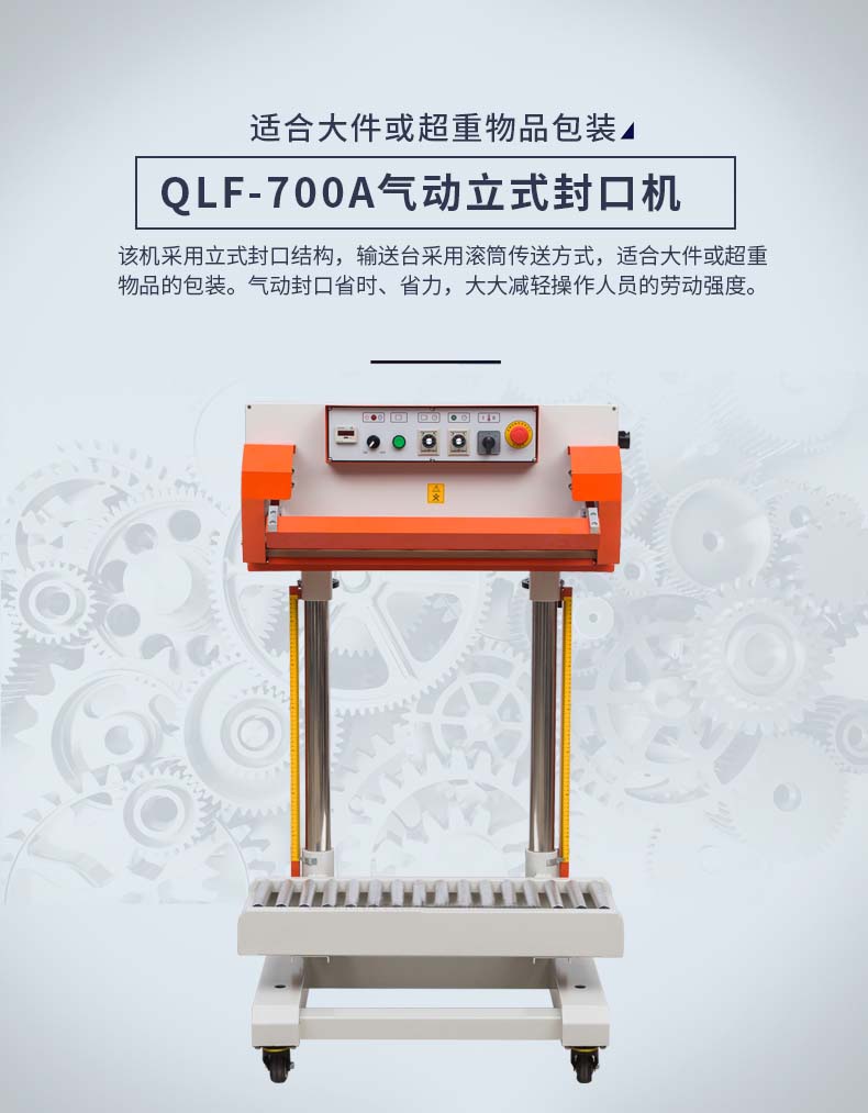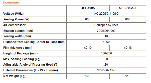 QLF-700A pneumatic sealer is widely used in chemical industry, foodstuff, feedstuff industries to seal various plastic film bags and compound bag whose sealing length is less than 700mm and weight is less than 50kg, but according to special order, the sealing length can be increased to 800mm, 1000mm. The machine can also run together with conveyor or production line.