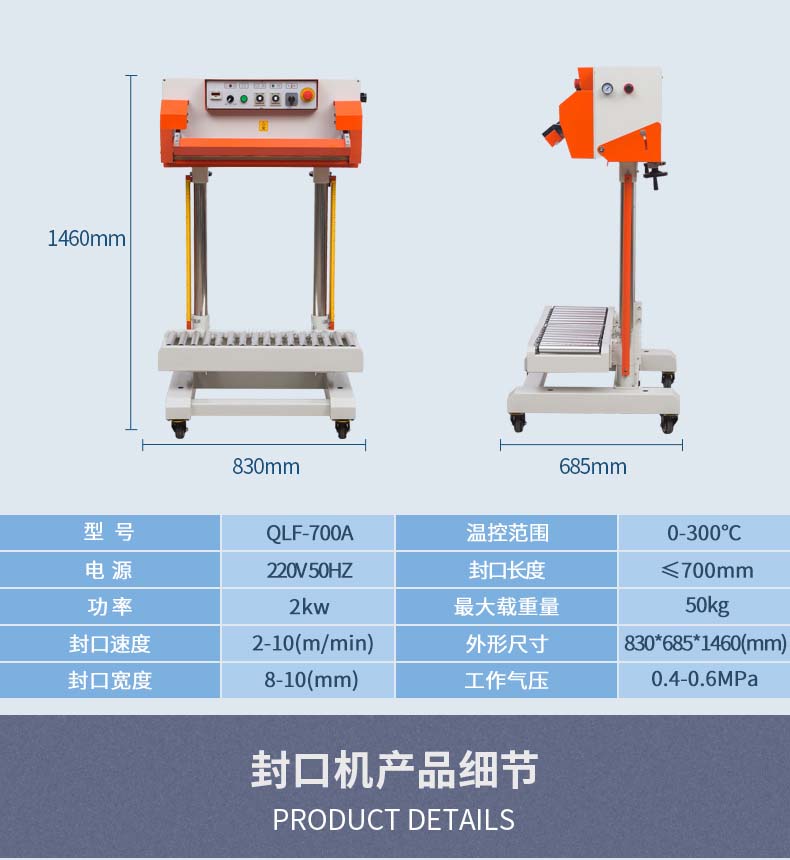 QLF-700Apneumatic sealer can be operated by hand or by pedal. For the thicker bag, you can choose pneumatic sealer QF -700L/S with function of double heating.